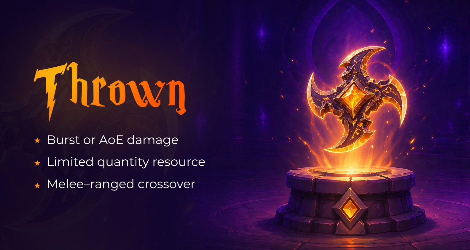 Throwing axes, bomb-type items, and projectile spears occupy a hybrid space that gives designers a useful tool: burst damage or area-of-effect output that doesn’t belong to either the melee or ranged archetype cleanly. These weapons are rarely a player’s primary option, but they serve important tactical functions — finishing enemies, breaking shields, applying crowd control, or enabling environmental interactions.