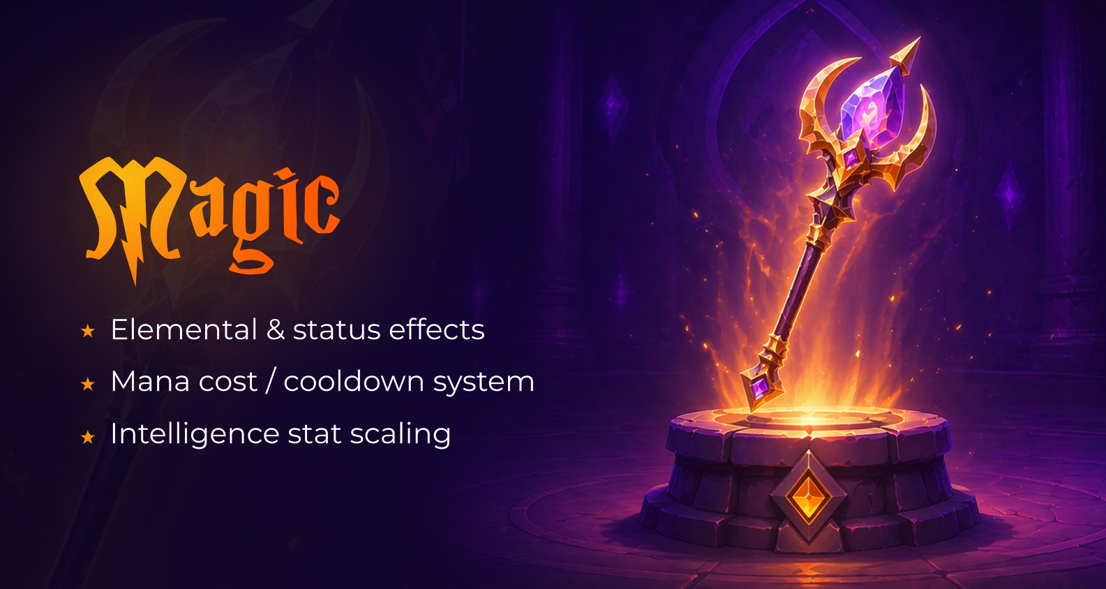 Staves, wands, spell catalysts, enchanted melee weapons, and tomes occupy a unique space in RPG weapon design. They’re defined less by physical form than by the systems they enable — elemental damage types, status effects, cooldown management, mana economy, and ability combinations.