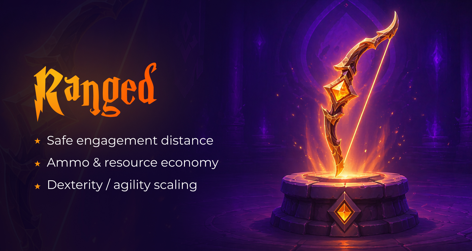 Bows, crossbows, slings, and thrown projectiles introduce a different design contract: safety in exchange for resource management. Ranged gameplay revolves around positioning, ammunition economy, and attack spacing — which means the tactical depth lives in systems design, while the production challenge lives in animation.