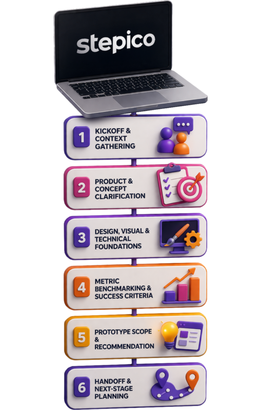 Discovery comes first because it defines what the prototype, POC, or MVP should prove. Stepico offers prototype and MVP development as separate services – you can learn more on their respective pages.